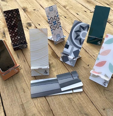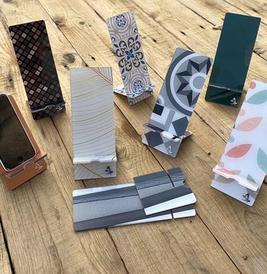 Supports téléphones pratiques et éco-responsables, conçus à partir de chutes neuves de matériaux.